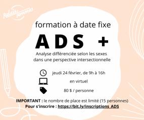 Cette journée de formation sur le thème de l'analyse différenciée selon les sexes et intersectionnelle, a été pensée et conçue pour des individu.es, groupes communautaires et de femmes, syndicats et institutions qui veulent poursuivre leur réflexion critique sur l'analyse différenciée selon les sexes et intersectionnelle, comme outil pour raffiner leur lecture des situations, des problématiques et des enjeux liés à l'égalité.