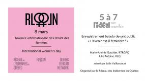 Le 8 mars prochain, afin de souligner la Journée internationale des droits des femmes, le Réseau des lesbiennes du Québec organise un 5 à 7 avec enregistrement de balado devant public. Venez prendre un verre et parler de féminisme! Pour susciter la discussion, Julie Vaillancourt reçois Marie-Andrée Gauthier et Julie Antoine dans une formule balado enregistrée devant public (c’est vous ça!) Elles se poseront la question : « L'avenir est-il féministe ». Vous aurez la possibilité des poser vos questions en direct!