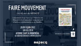 Faire mouvement retrace la contribution du MÉPACQ au développement d’un mouvement citoyen de transformation sociale en mettant de l’avant les bons coups, mais sans faire l’impasse sur les difficultés rencontrées en chemin.