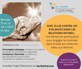 Cette communication présente la démarche réflexive amorcée par un groupe de jeunes hommes dans le cadre du projet de recherche-action participative Avec elles contre les violences dans les relations intimes dans la région du Saguenay-Lac-Saint-Jean. Les jeunes hommes de ce groupe participent à une réflexion autour de leur positionnement d’alliés et de la masculinité en lien avec les violences faites aux femmes et aux filles, en plus de réaliser quatre actions de sensibilisation contre ces violences. Un comité aviseur composé de jeunes femmes veille à ce que ces actions soient cohérentes avec les besoins et les aspirations des militantes féministes. Les participants adoptent également une approche basée sur le disempowerment, qui vise la réduction du pouvoir qu’exercent les hommes sur les femmes et les féministes (Dupuis-Déri, 2014). Cette communication présente les analyses préliminaires tirées des cinq premières rencontres tenues avec le groupe de jeunes hommes. Elle montre comment a évolué le rapport à la masculinité et le positionnement d’allié des participants depuis le début de la démarche. Il est également question de l’influence de cette expérience sur les relations que les jeunes hommes entretiennent avec les femmes de leur entourage et leurs pairs masculins.