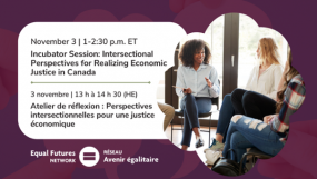 Le 3 novembre, de 13 h à 14 h 30 (HE), joignez-vous au Réseau Avenir égalitaire pour un atelier de réflexion virtuel interactif pendant lequel on décortiquera certains des principaux obstacles auxquels font face les femmes, les personnes de la diversité de genre et les communautés racisées dans la quête de justice économique. Les ateliers de réflexion sont une occasion d'éliminer les cloisonnements dans notre secteur et entre les régions et de favoriser le dialogue et les partenariats pour promouvoir l'équité entre les genres. Des intervenantes, cheffes de file et chercheuses vous partageront leur savoir sur des domaines clés de la justice économique pour diverses communautés au Canada et dans le monde. Vous aurez ensuite l'occasion d'échanger en petits groupes sur les enjeux, les défis et les obstacles qui minent la justice économique en puisant dans vos expériences vécues et votre travail. Pour progresser vers l'équité économique, il faudra s'éloigner du statu quo et s'attaquer aux défis structurels et systémiques en suivant la voie tracée par les femmes, les personnes bispirituelles et de la diversité de genre et les communautés LGBTQ+ et PANDC.