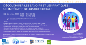 L’objectif premier de ce webinaire est de permettre une réflexion critique sur la hiérarchie des savoirs, laquelle n’a pas cessé de s’imposer en promotion de la santé malgré le nombre accru de voix qui s’élèvent pour un changement de paradigme à cet égard. La décolonisation des savoirs et des pratiques en promotion de la santé répond à un impératif de justice sociale puisqu’elle implique de mettre en lumière les mécanismes politiques et sociaux susceptibles de contribuer à la propagation et l’accroissement des inégalités de santé à l’échelle globale.