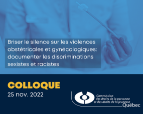Au Québec, de plus en plus de patientes, d’intervenantes, d’organismes communautaires et de chercheuses œuvrent à documenter les VOG afin de mieux protéger les victimes d’injustices. C’est dans ce contexte que la Commission des droits de la personne et des droits de la jeunesse organise ce colloque. Celui-ci contribuera à informer le public sur la problématique des VOG et, par extension, sur les droits et libertés des femmes visées. Il fera également état des connaissances pratiques et savantes sur la question et identifiera les besoins en matière de recherche, et ce, en plaçant au centre des discussions les intérêts et la voix des principales concernées, particulièrement les femmes autochtones, les femmes noires et les femmes appartenant à d'autres minorités racisées.