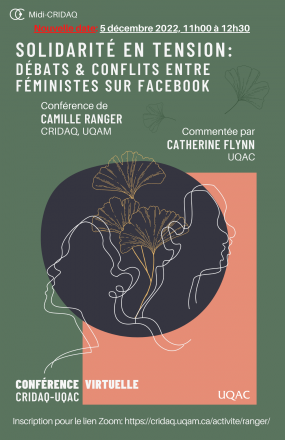 Camille Ranger s’est intéressée aux rôles et aux conséquences des call-outs dans les groupes féministes progressistes québécois sur Facebook. Dans le cadre de cette conférence, elle rapportera d’abord les principaux résultats de son enquête avant de présenter le concept de solidarité agonistique (Bonnie Honig), une proposition normative qui vise à penser les conditions nécessaires pour faire du conflit un moment créateur de solidarité plutôt que du contraire. Les réflexions proposées ici s’ancrent dans une perspective transdisciplinaire, inspirée à la fois de la pensée politique de Hannah Arendt, Judith Butler et Bonnie Honig, et des théories féministes de Julietta Singh, bell hooks et Audre Lorde.