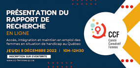 Le 8 décembre prochain, les membres de l'équipe de recherche viendront présenter le cadre de l'étude, les objectifs, la méthodologie empruntée et les principaux résultats obtenus. Cette présentation sera suivie d'une allocution du CCF sur les enjeux vécus spécifiquement par les femmes en situation de handicap et présentera ses recommandations en la matière.