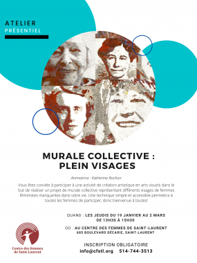 Vous êtes conviée à participer à une activité de création artistique en arts visuels dans le but de réaliser un projet de murale collective représentant différents visages de femmes féministes marquantes dans votre vie. Une technique simple et accessible permettra à toutes les femmes de participer, donc bienvenue à toutes!