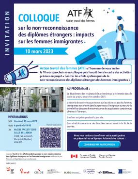 Action travail des femmes (ATF) a l’honneur de vous inviter le 10 mars prochain à un colloque qui s’inscrit dans le cadre des activités prévues au projet « Contrer les effets systémiques de la non-reconnaissance des diplômes étrangers des femmes immigrantes », dont les partenaires principaux sont : le Comité consultatif Femmes (CCF), le Conseil d'intervention pour l'accès des femmes au travail (CIAFT), la Chaire de recherche sur l'intégration & la gestion des diversités en emploi (CRIDE), le Groupe interuniversitaire et interdisciplinaire sur l'emploi, la pauvreté et la protection sociale (GIREPS), L’Institut de coopération pour l'éducation des adultes (ICÉA), l’Observatoire québécois des inégalités, le Réseau d'action pour l'égalité des femmes immigrées et racisées du Québec (RAFIQ) et la Table de concertation des organismes au service des personnes réfugiées et immigrantes (TCRI).